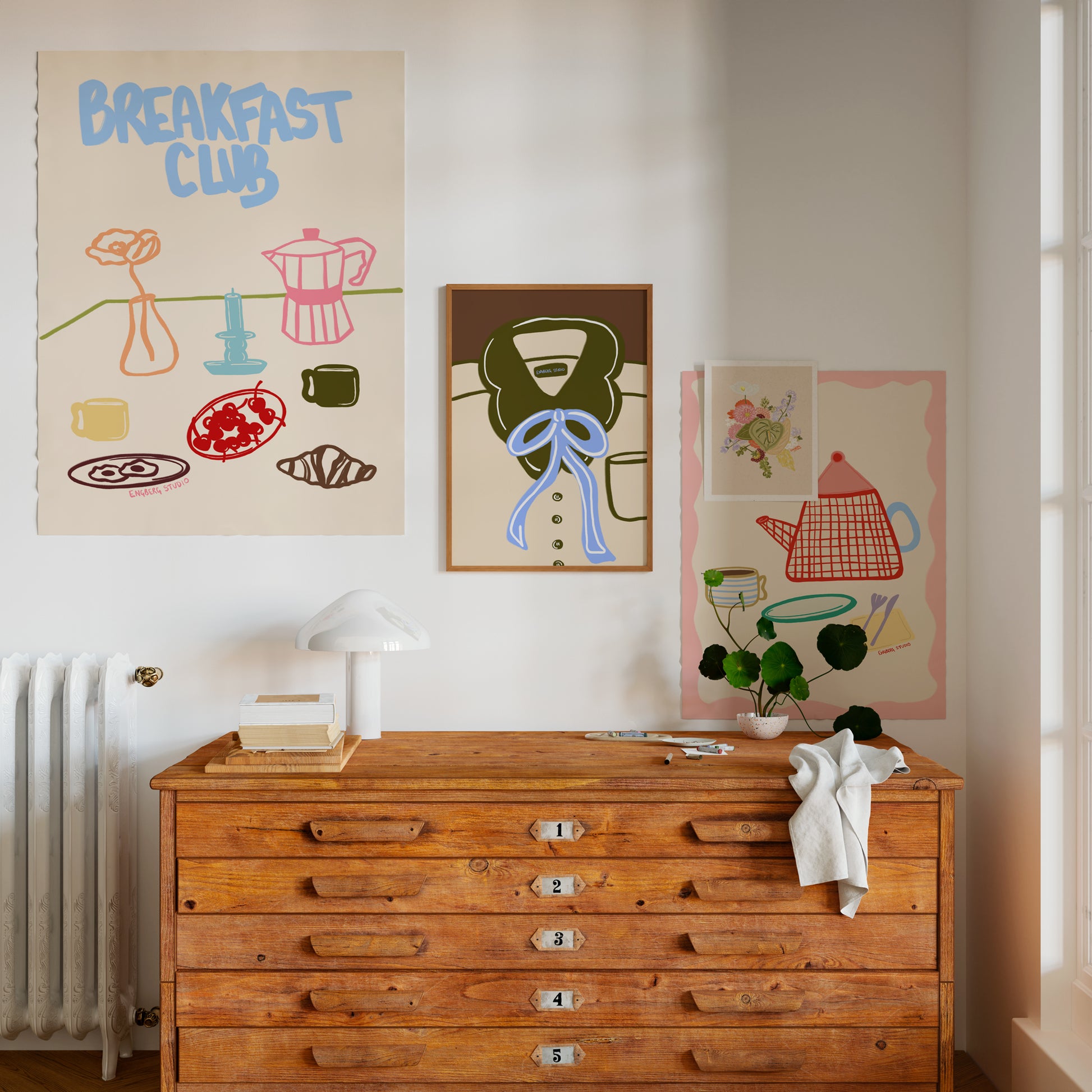 This contemporary art print by Engberg Studio features a playful illustration of a collared blouse tied with a soft blue bow, rendered in warm, earthy tones. With its hand-drawn lines and Scandinavian-inspired aesthetic, the print adds a stylish, characterful touch to modern interiors and curated gallery walls.